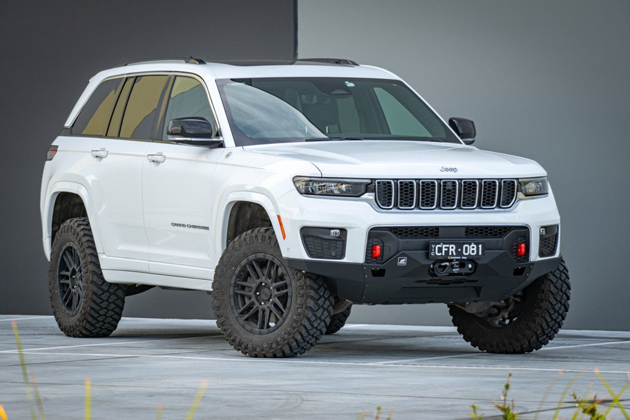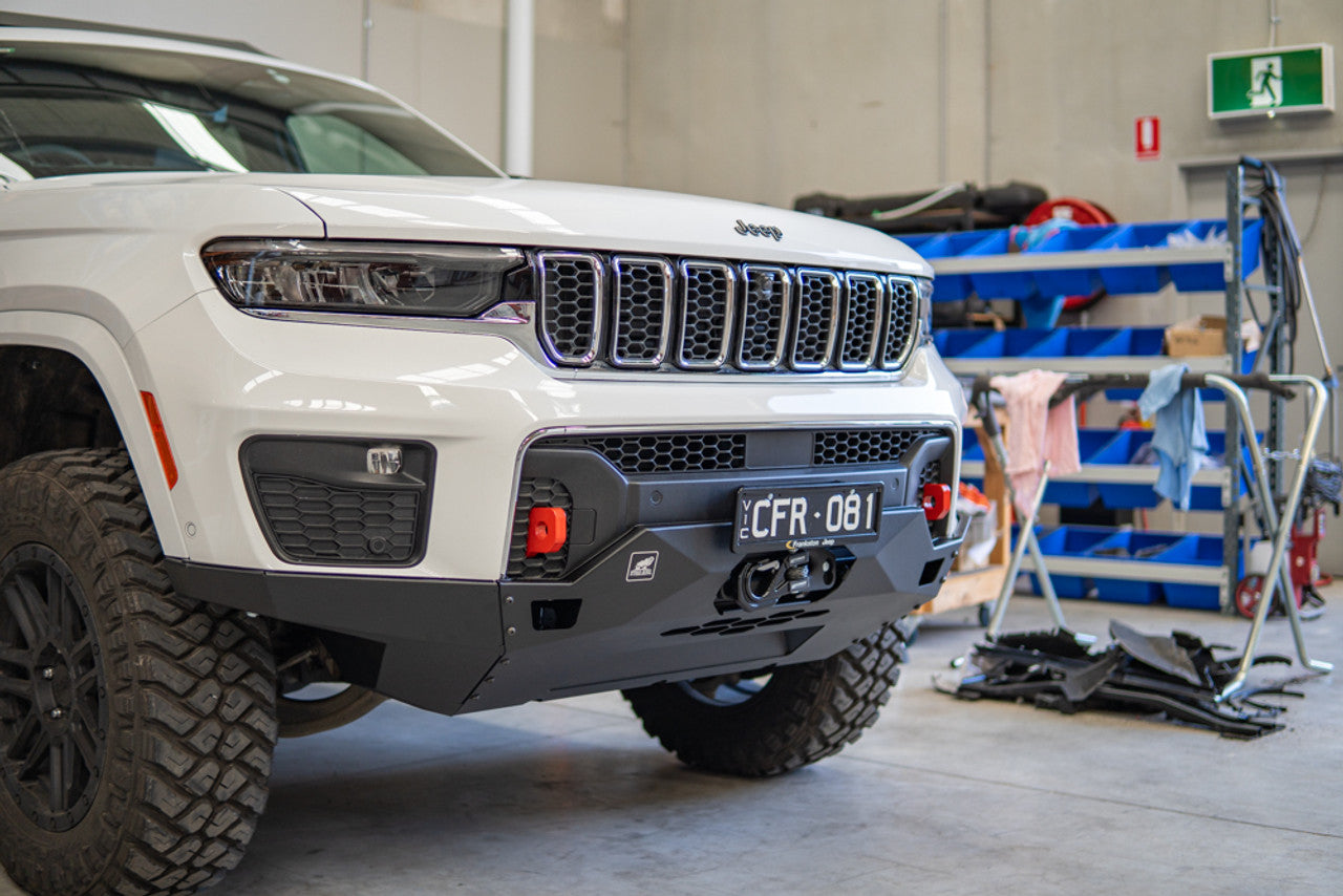 While the Grand Cherokee WL (5 seater) and L (7 Seater) are a good looking rig, they lack some frontal protection and have a vulnerable front end not really that suited for going off road. With no protection you're likely to either scratch, gouge or even rip off your factory bumper. Fear not, Offroad Animal has a super stylish Pre runner style steel front bumper system for your rig. This steel bumper basically acts like a bash plate system while give you tons more clearance which also reduces the risk of front end damage.